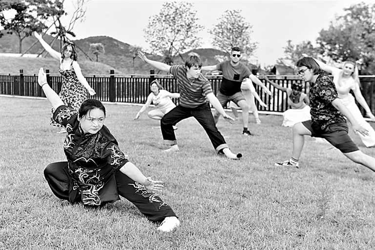 山东日照职业技术学院体育部老师在教授英国利兹贝克特大学学生学习中国武术。新华社发